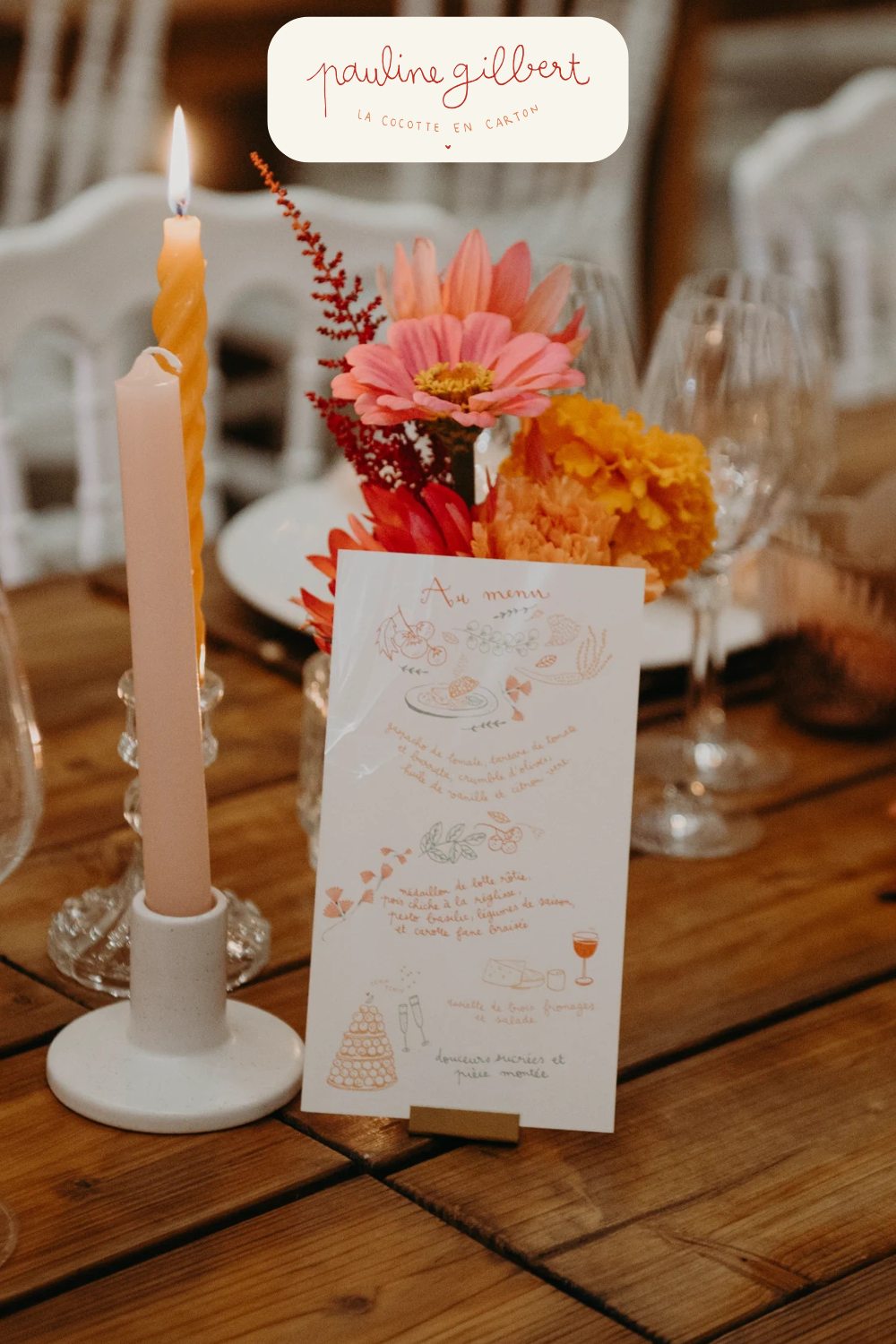 Pour un mariage explosif et joyeux, osez un mix de couleurs bien dosé et des illustrations qui respirent la fête. N’hésitez pas à créer une personnalisation si vous avez un thème très précis.