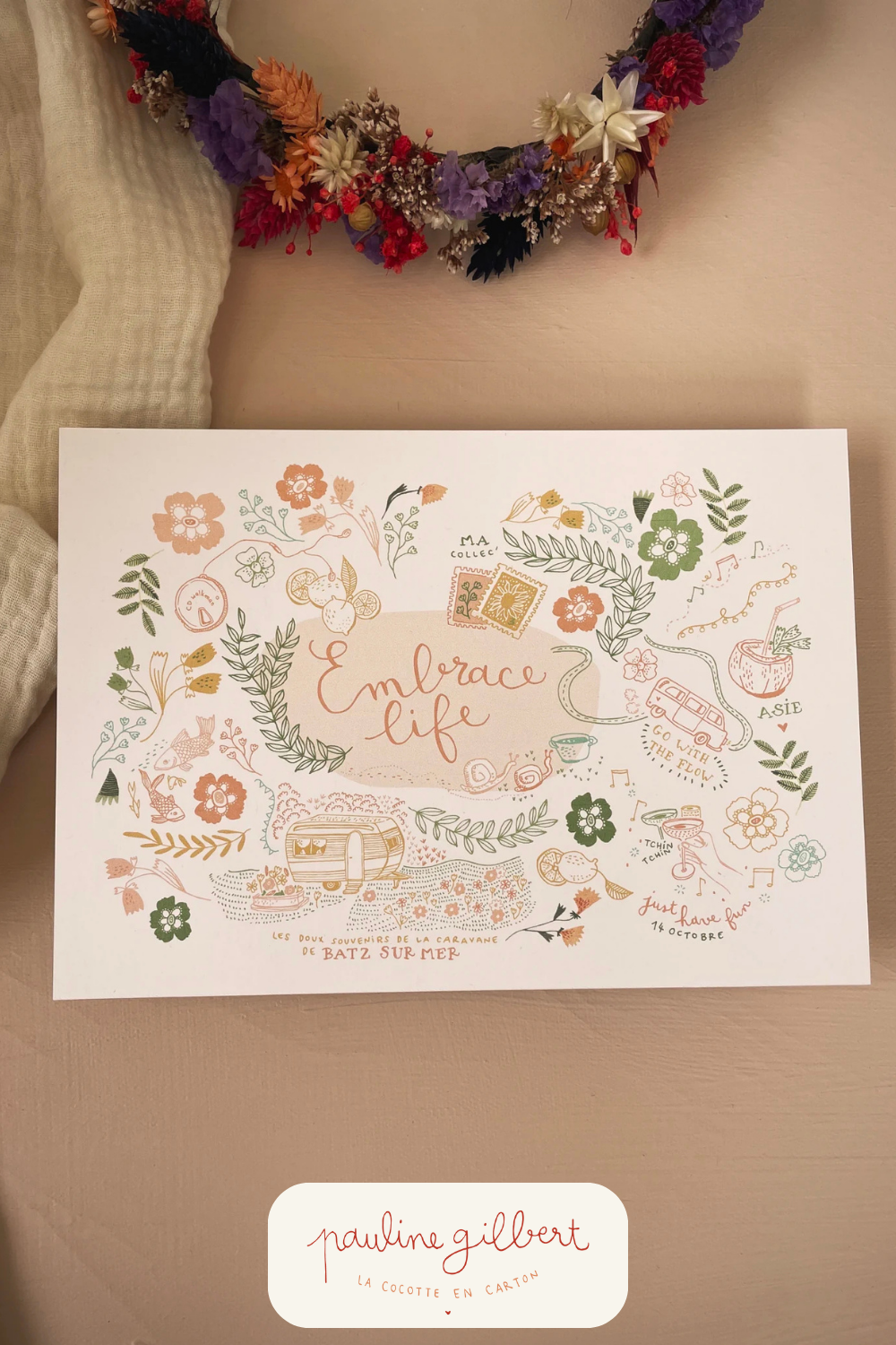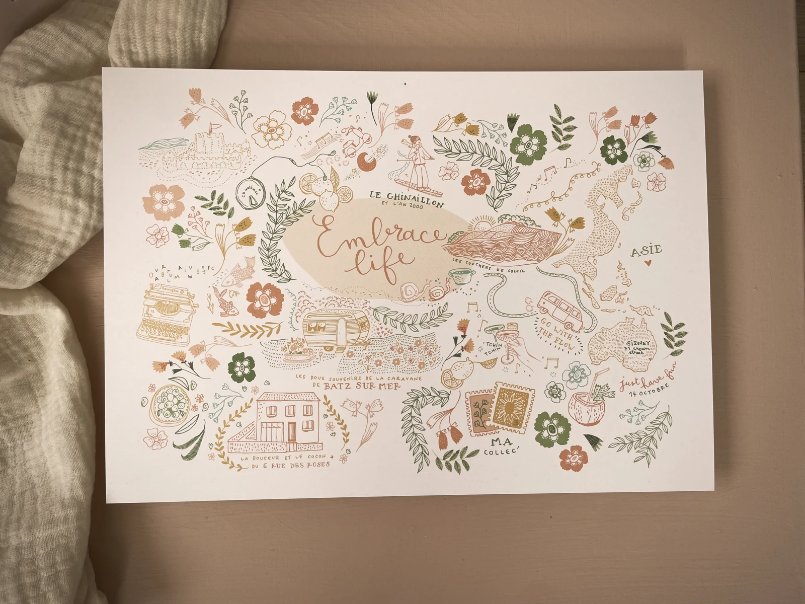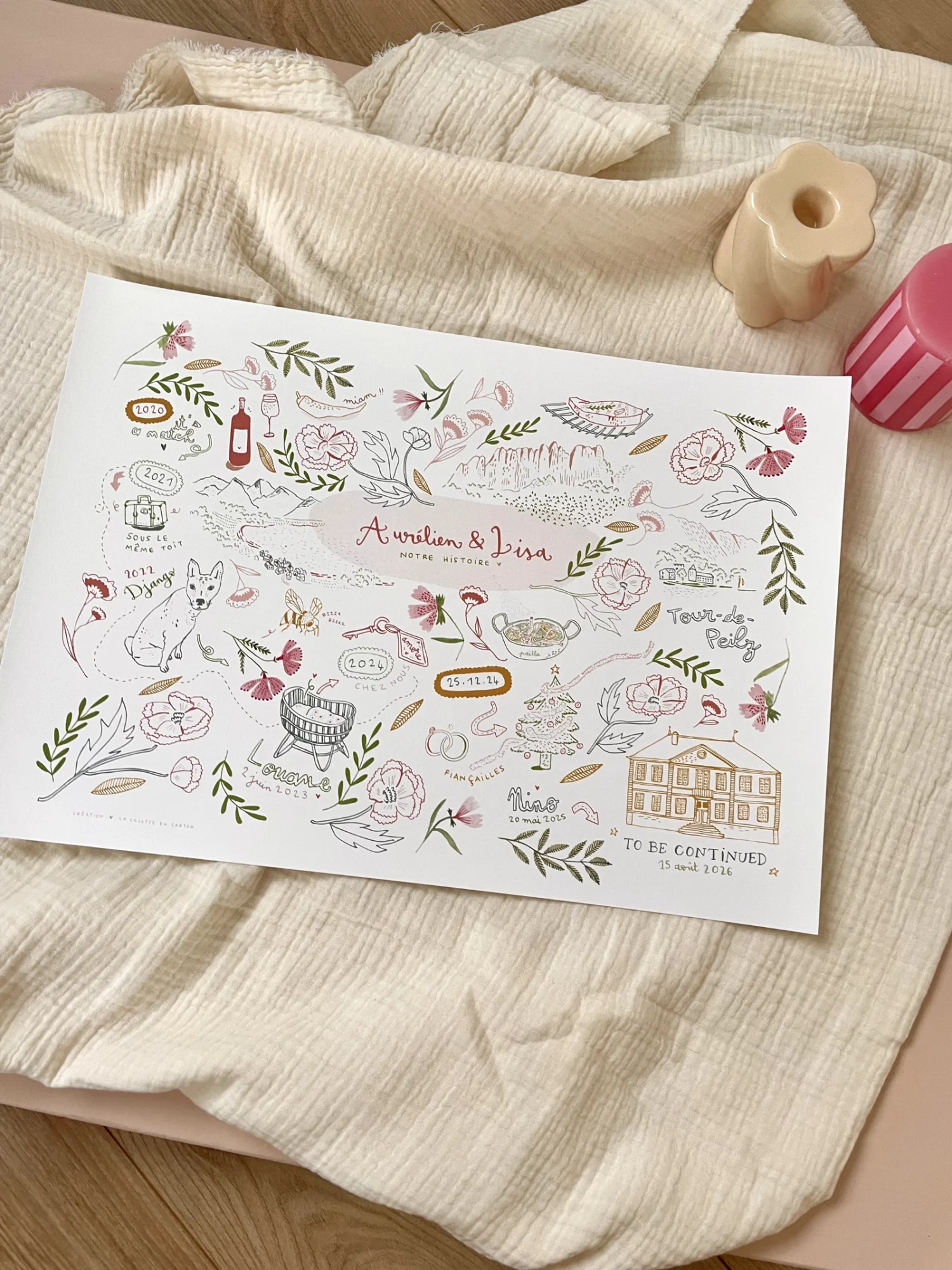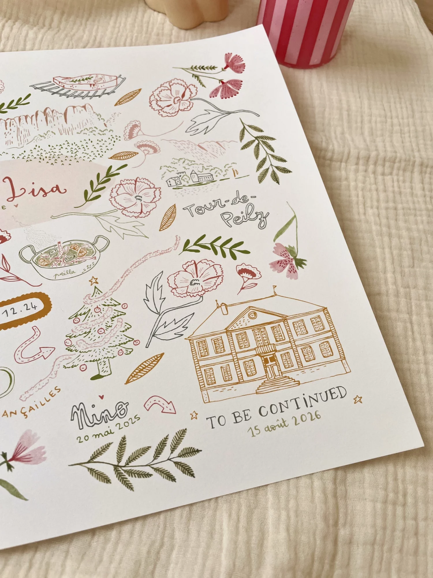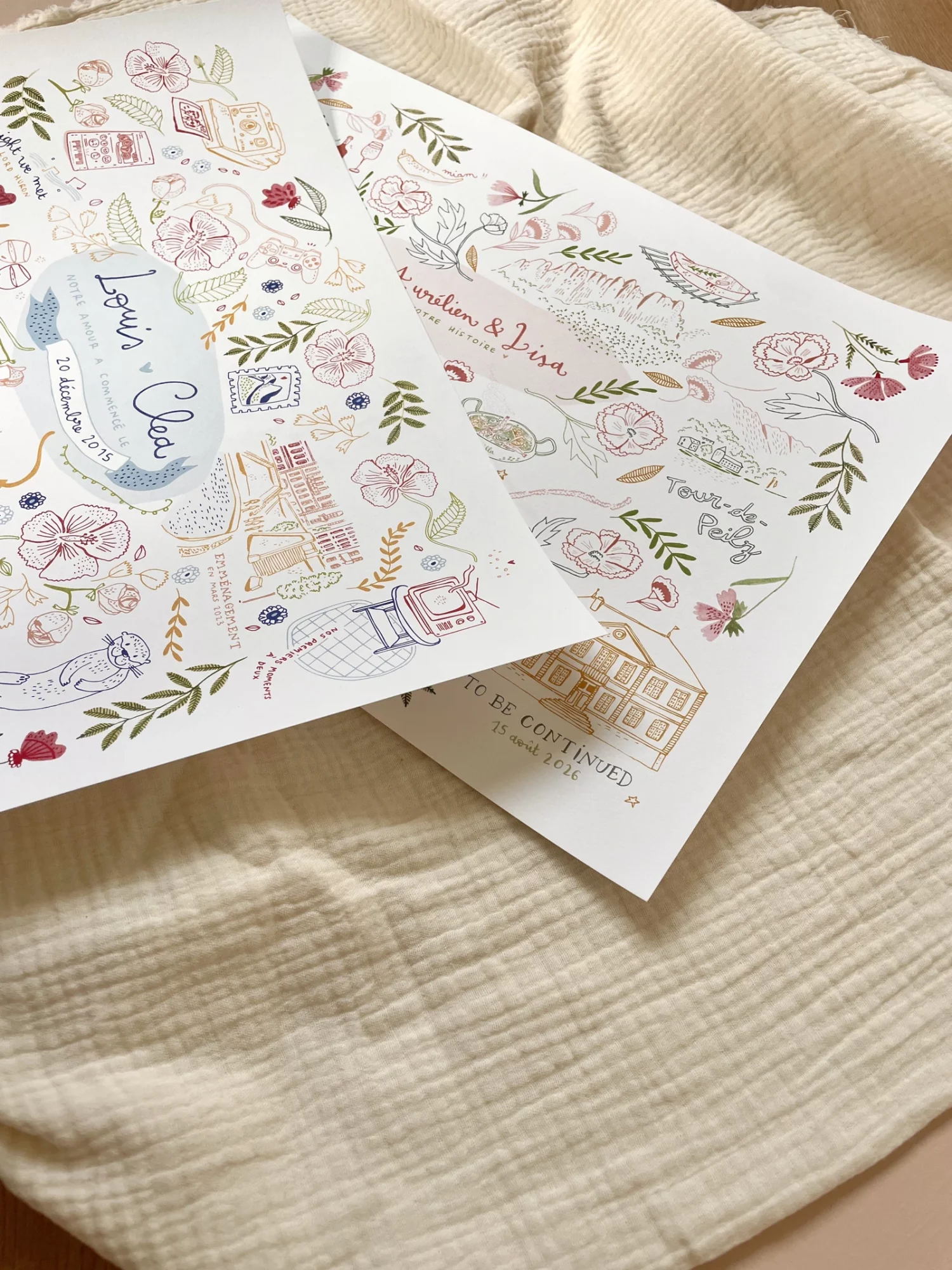 Chaque affiche est unique et raconte une histoire : celle d’une personne, d’un couple, d’une famille ou même d’un groupe d’amis. Toutes les créations sont illustrées à la main, mêlant dessin au trait et illustrations végétales à l’aquarelle.