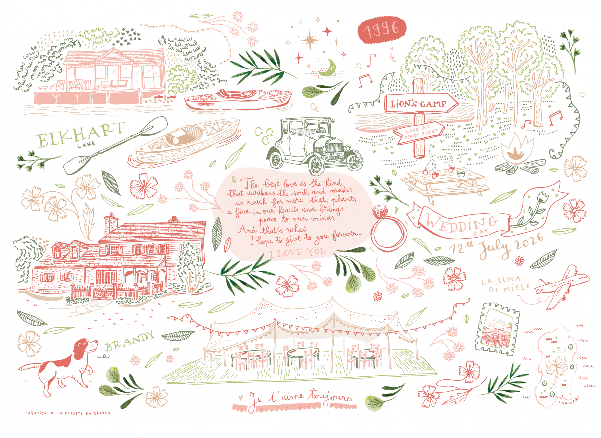 Erin souhaitait surprendre son futur mari en lui offrant un cadeau original avant leur mariage. Ensemble, nous avons imaginé une affiche très romantique (car ces deux-là le sont beaucoup), mettant en scène les lieux importants de leur histoire : leur lieu de rencontre, un camp de vacances pour adolescents, leurs voyages, ainsi que des dates symboliques comme leur rencontre, leur mariage, sans oublier leur chien adoré.