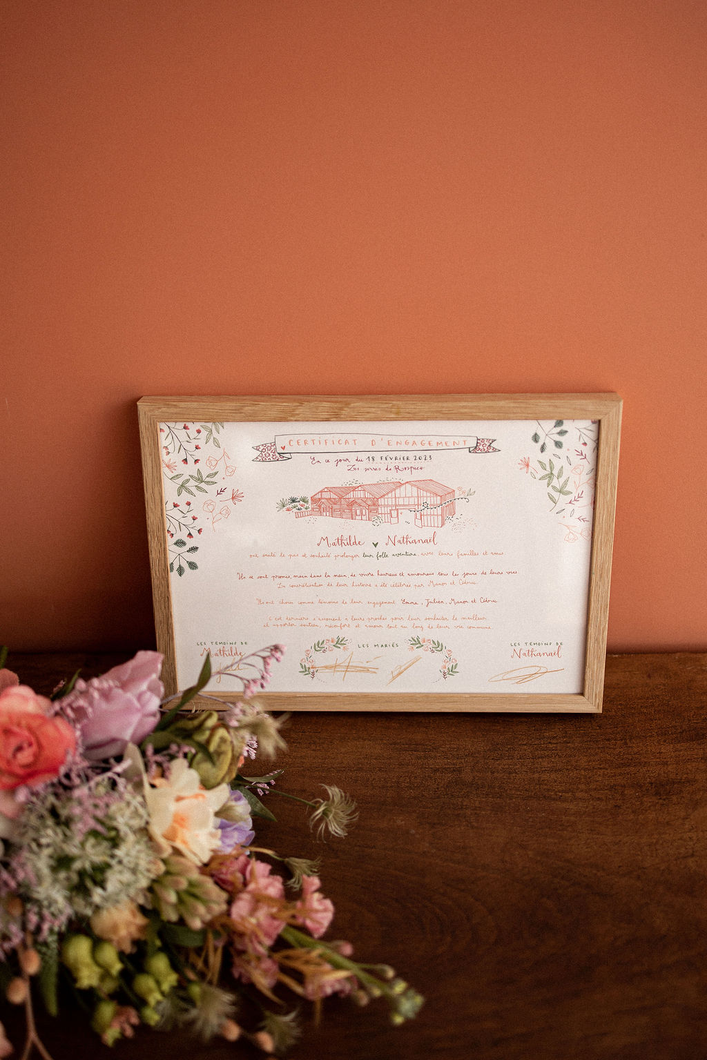 Suite à la demande et l’idée d’un couple de clients qui souhaitaient garder un souvenir de ce moment très fort pour eux, nous avons créé ensemble, leur certificat, une jolie illustration à garder précieusement pour ce souvenir de ce moment unique.