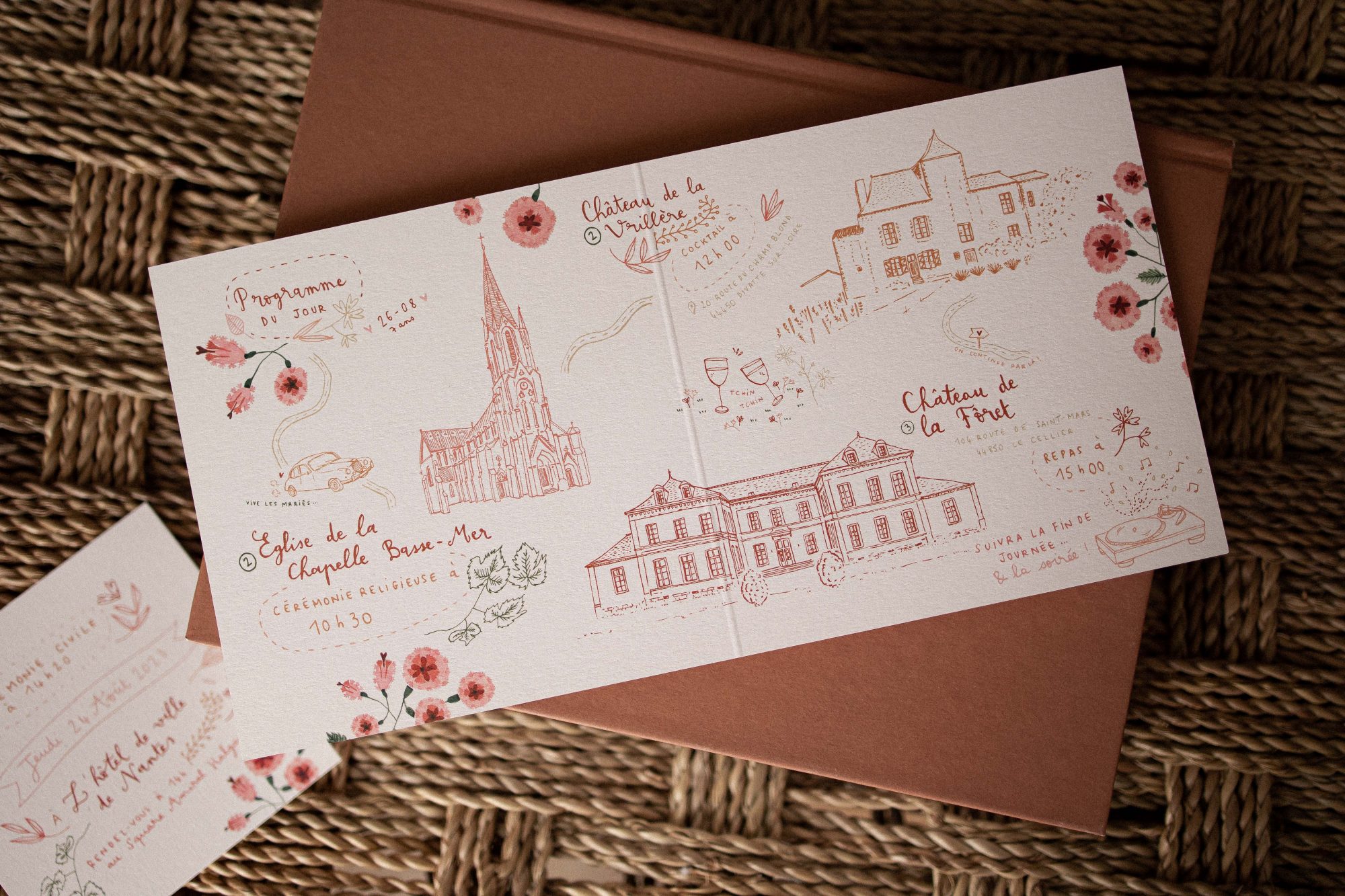 Faire dessiner le lieu de votre mariage permet de vous démarquer. Ce choix artistique apporte une note singulière et marquante. Vos invités se souviendront plus facilement du lieu et de l’ambiance du jour J, dès la première lecture.