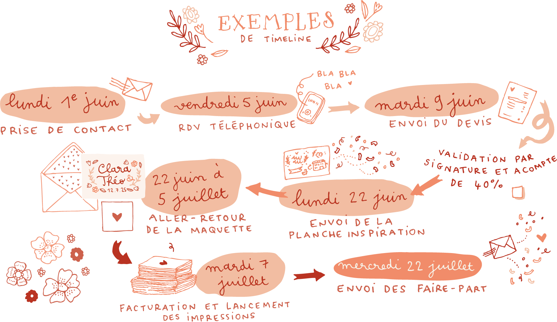 C’est un moment important : vous me parlez de votre histoire, de vos envies, et je vous présente les options possibles (types de papiers, envois, éléments à placer sur recto/verso…).