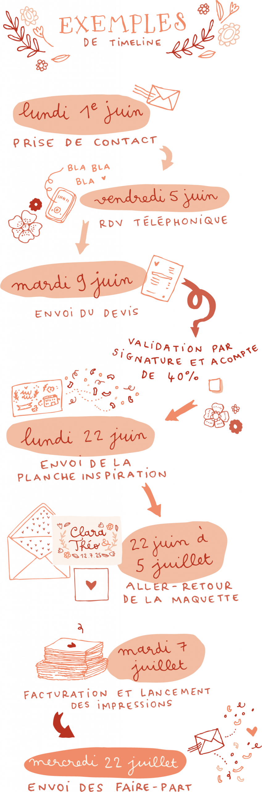 Pour une création sur mesure, il faut compter environ 6 à 8 semaines de délais, du premier contact jusqu’à la réalisation des faire-part de mariage réceptionnés chez vous.