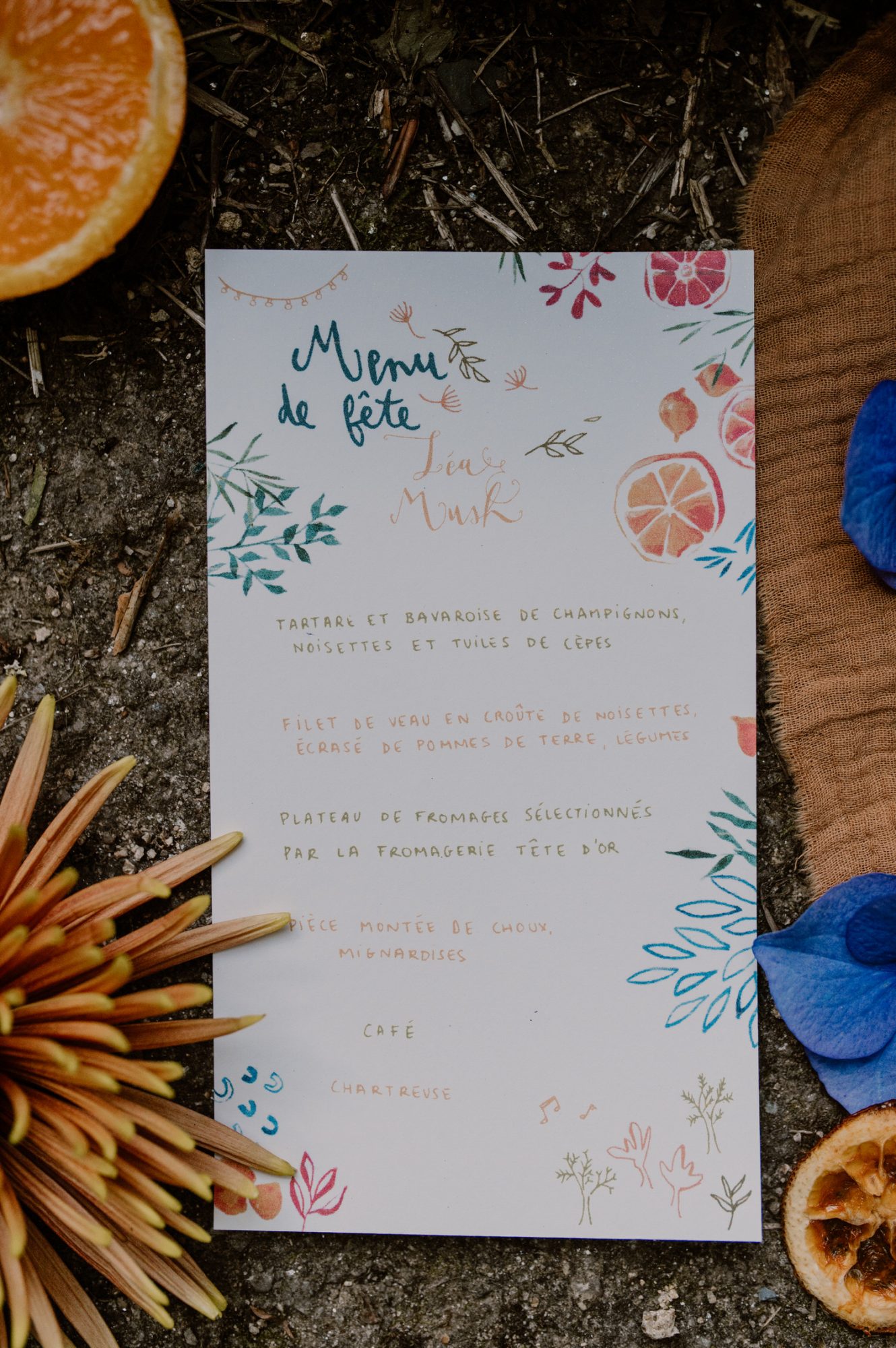 Le menu illustré ne vit pas seul. Il s’inscrit dans une identité graphique globale, pensée dès le faire-part.