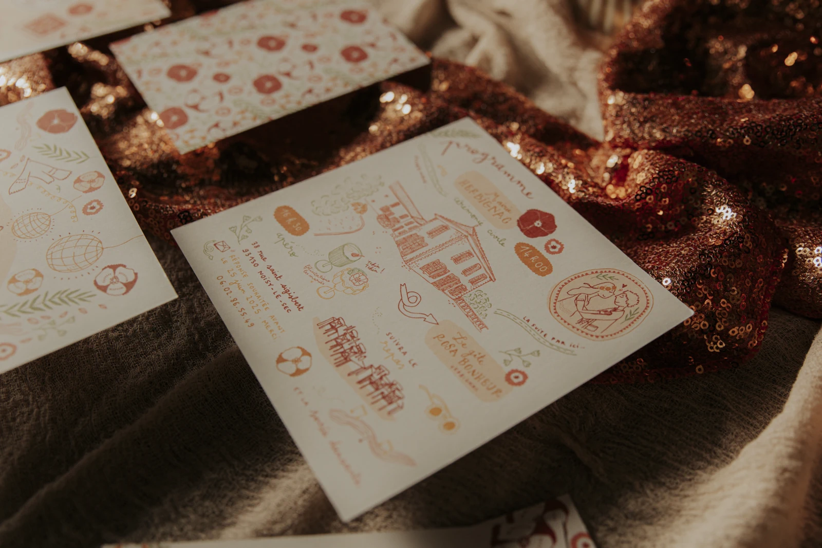 Pauline GILBERT - La Cocotte en Carton - faire-part mariage bohème - faire-part mariage original illustration de lieu de réception - récit illustré