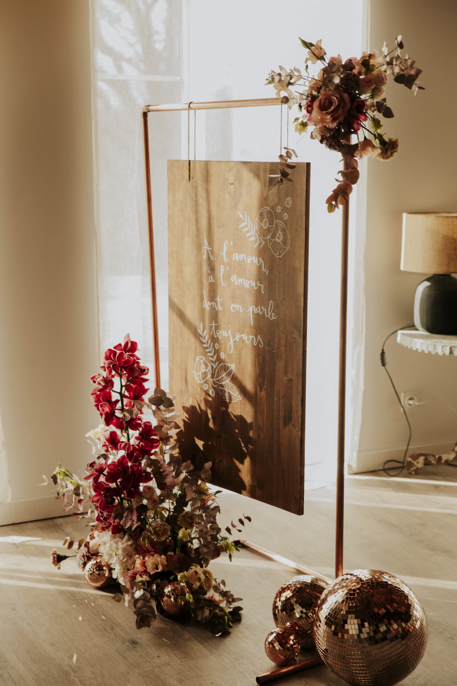Finalisez l’ensemble de la papeterie du jour J. Si vous aviez prévu un cadeau invité personnalisé, il est maintenant temps d’assembler les éléments. Pensez aussi au gobelet réutilisable ou au panneau d’entrée de salle.