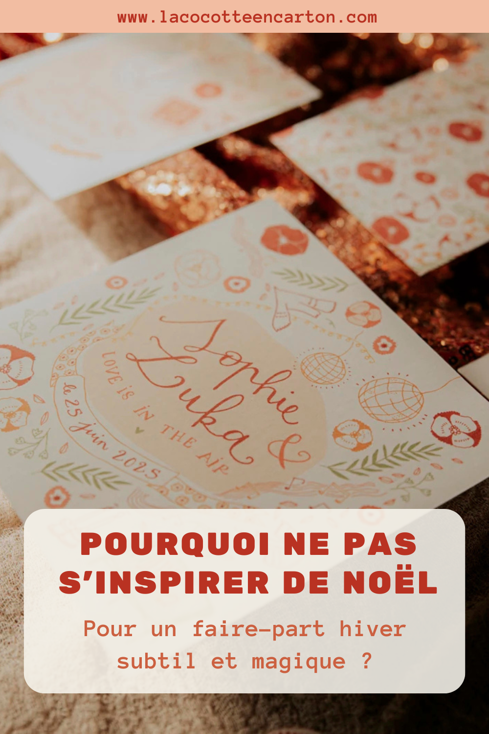 Avant même le faire-part, vous pouvez envoyer un save the date, qui permettra à vos invités de se projeter dans l’univers de votre mariage. Vous pouvez opter pour une photo à personnaliser, un modèle prédéfini ou une création sur-mesure avec couleurs et illustrations hivernales. Cela donne du sens et de la magie dès le début de votre histoire.
