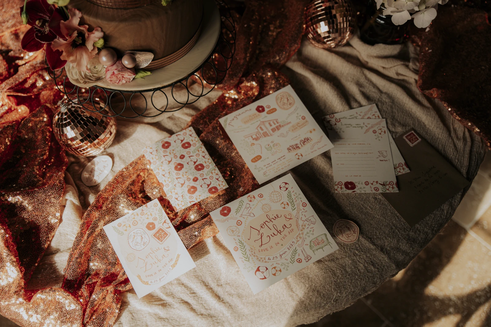 Pour les futurs mariés sensibles aux ambiances douces, cosy et poétiques, on imagine parfaitement des illustrations inspirées de livres, de jeux de société ou encore de jolies tasses de thé pour accentuer l’esprit hivernal.