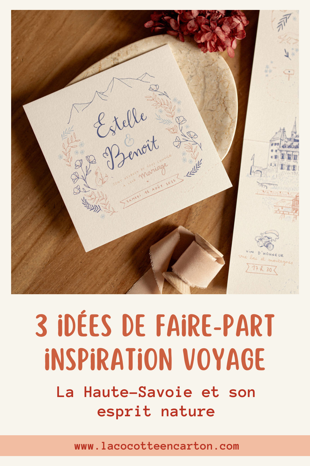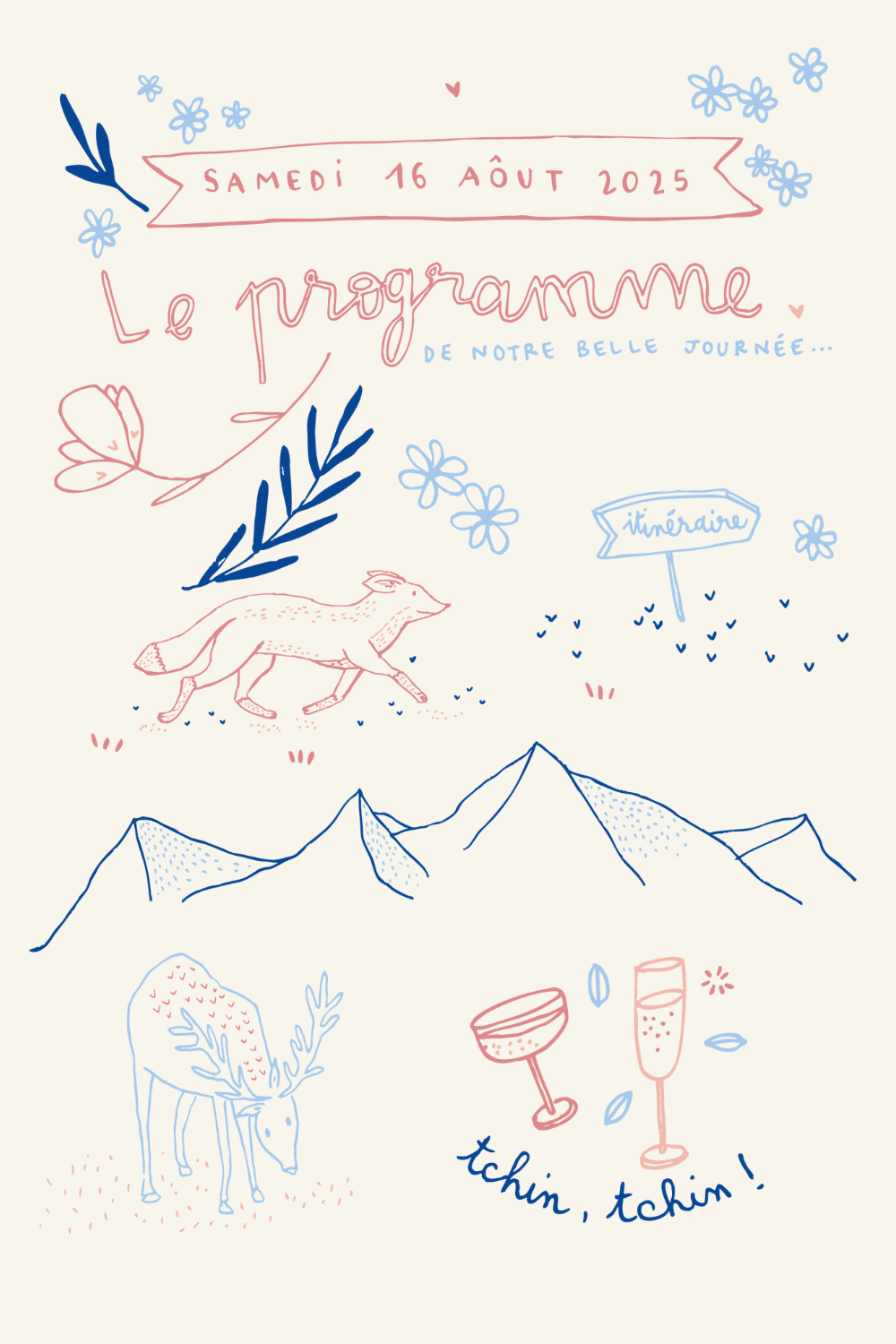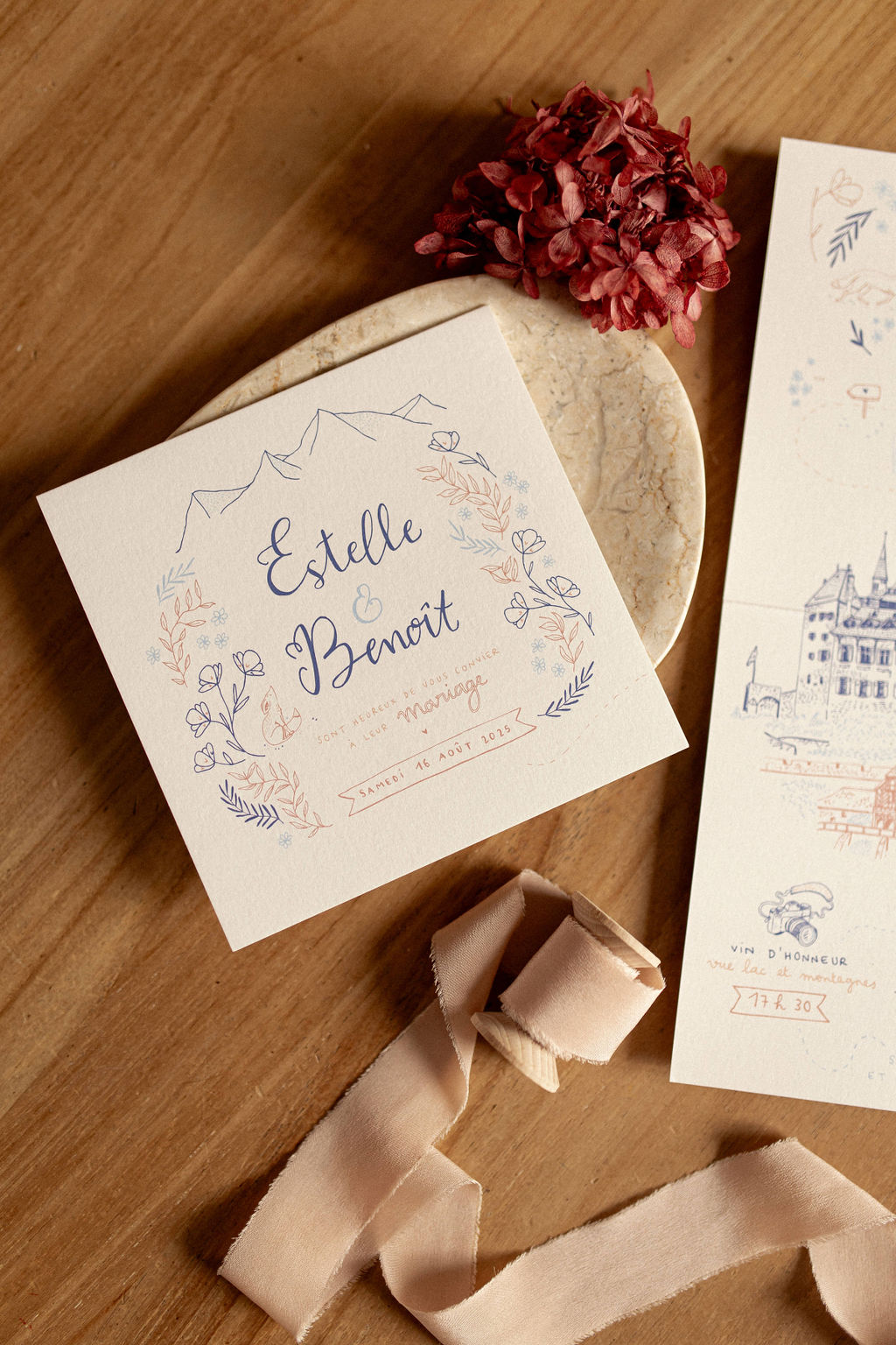 Un faire-part illustré inspiré de la Haute-Savoie invite vos proches à une célébration au cœur des montagnes.