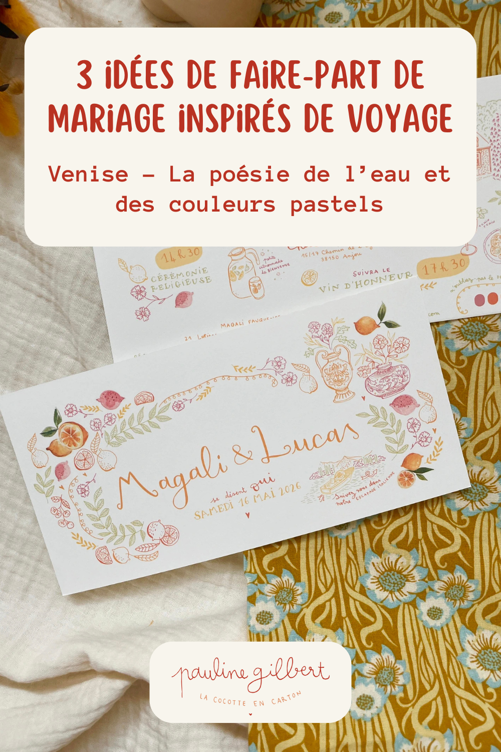 Entre ses canaux miroitants, ses palais vénitiens aux teintes pastels et la danse lente des gondoles, elle incarne une douceur intemporelle. Un faire-part de mariage inspiré de Venise peut capturer cette atmosphère grâce à des illustrations faites à la main : agrumes juteux, façades ocre et rose poudré, vases ancestraux…