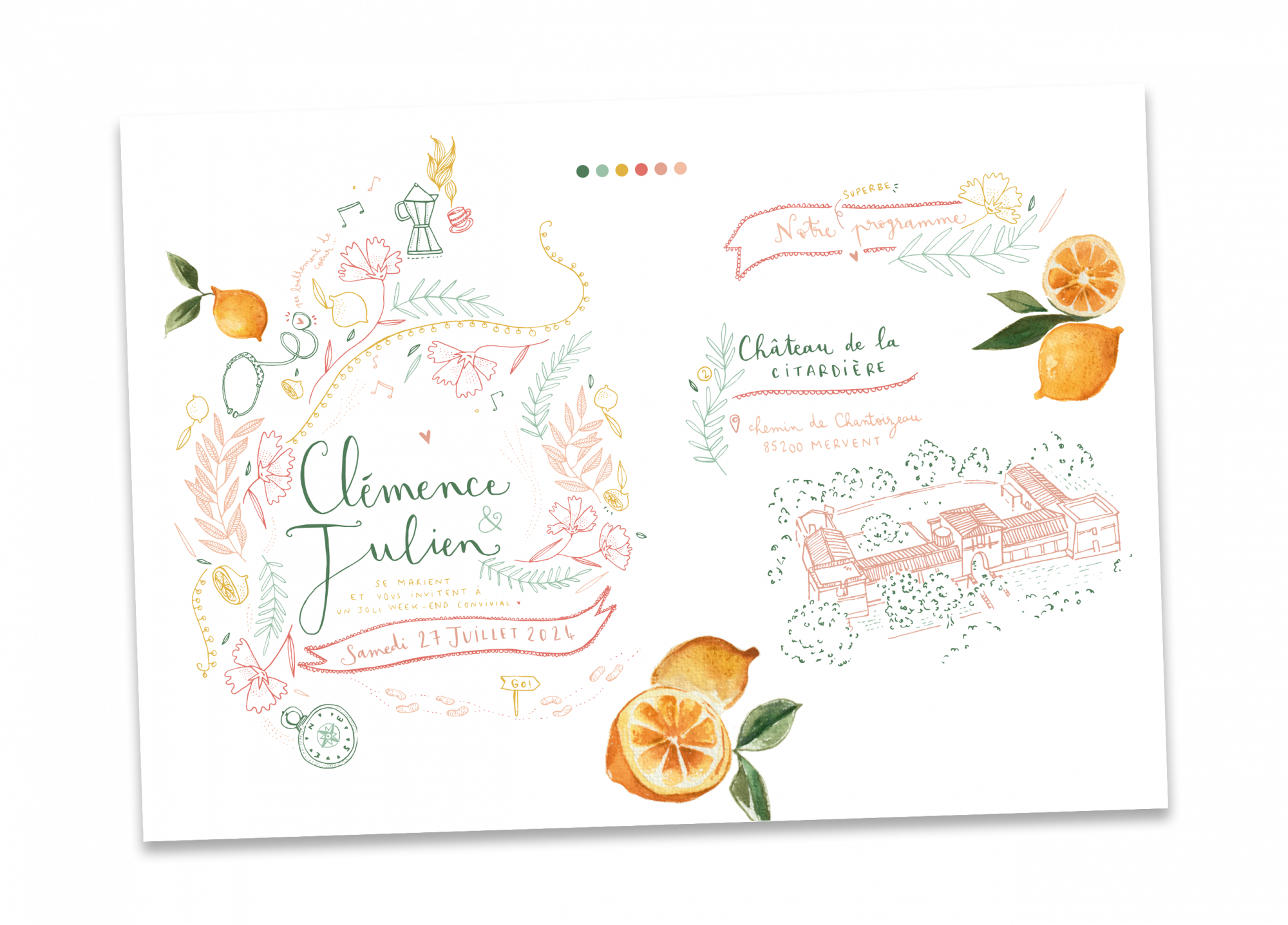 Avant de réaliser la maquette finale, je propose toujours une planche d’inspiration : une première ébauche avec les prénoms illustrés, un lieu de réception dessiné à la main et une ambiance visuelle. C’est une étape appréciée par les couples, car elle leur permet de se projeter et d’ajuster les derniers détails. Ils me donnent leurs indications et leurs idées que je développe sur la maquette au format choisi.